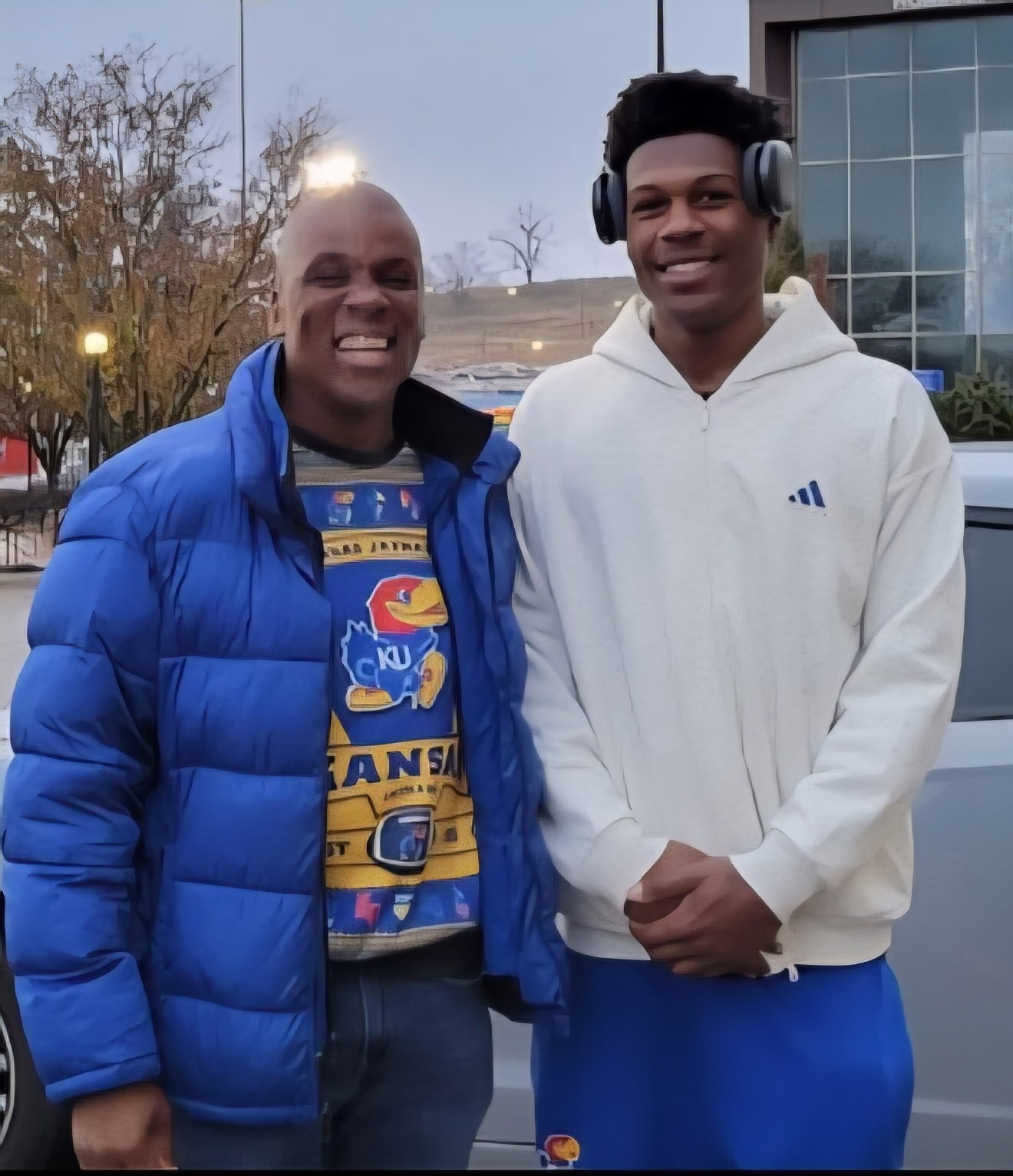 Winter 2024: Coach Baker with former Rockford Jefferson stand-out AJ Storr after AJ's game for Kansas University, Coach Baker's favorite team! Rock, Chalk!